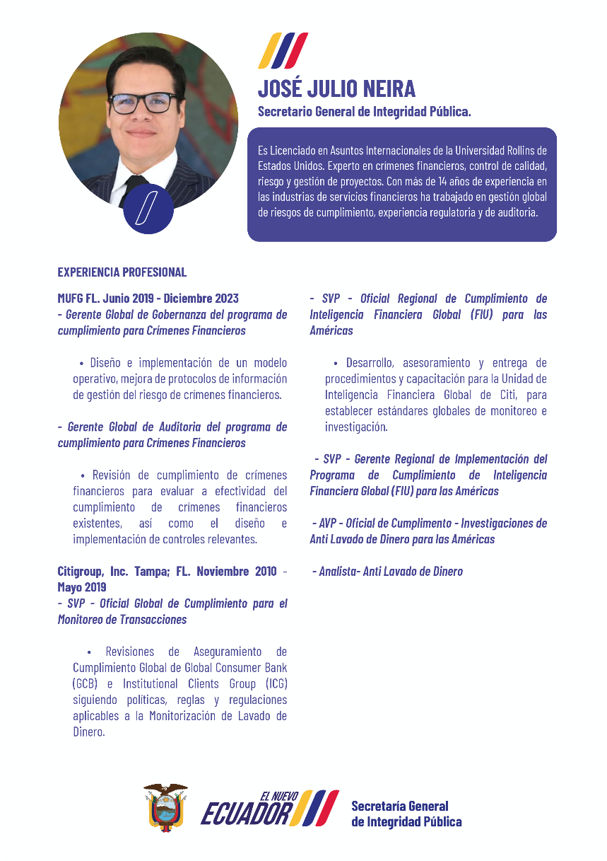 Uno de los expertos en seguir el dinero o hilo del ovillo, es José Julio Neira, actual director de la UAFE, pero a la vez secretario de Integridad Pública del Estado (lo que era la antigua Secretaría Anticorrupción), adscrita a la Presidencia de la República. Experto en crímenes financieros, con más de 14 años de experiencia en la industria de servicios financieros ha trabajado en gestión global de riesgos de cumplimiento, experiencia regulatoria y auditoría y en la persecución del lavado de dinero. Esta experticia lo lleva a cuestionar que en las recientes reformas aprobadas a la Ley de prevención del lavado de activos, los oficiales de cumplimiento (definido como el funcionario de nivel gerencial, responsable de verificar la aplicación de la normativa inherente a la prevención de lavado de activos y el financiamiento de delitos) no tienen responsabilidad alguna en lo civil o penal respecto a una «ceguera voluntaria» sobre lo que vigila. Un oficial de complimiento, que es el núcleo del sistema antilavado de activos, «establece sistemas de evaluación y monitoreo para reportar transacciones sospechosas. Recibe, registra y atiende con prontitud todo lo referido a situaciones sospechosas que notifique el personal de la institución, entidad, empresa u organización». De acuerdo con las recomendaciones del GAFI, los oficiales de cumplimiento deben ser responsables por lo que hacen o dejan de hacer (en EE.UU. esa responsabilidad dura siete años), menos en Ecuador gracias a las reformas que hizo la Asamblea al proyecto de Ley.